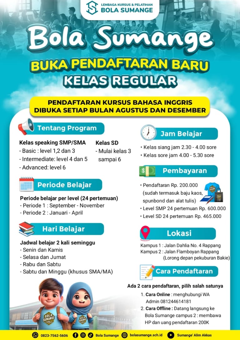 Bola Sumange telah memberikan pengalaman belajar yang luar biasa. Metode pengajaran yang efektif dan pengajar yang berpengalaman membuat saya semakin percaya diri dalam berbahasa Inggris.